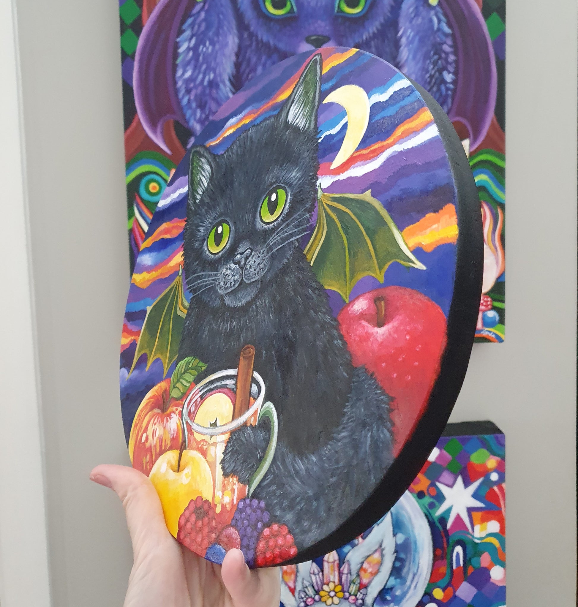 This spooky little kitty-bat will surely warm your heart as he flies near you. He is a little bit spicy and a whole lot of sweetness, just like his favourite drink - Apple Cider. When you sip on a warm cup of hot cider on an autumnal evening, Apple Cider the kitty-bat is likely nearby, spreading his vibes of mystery, magic and warm cosiness.