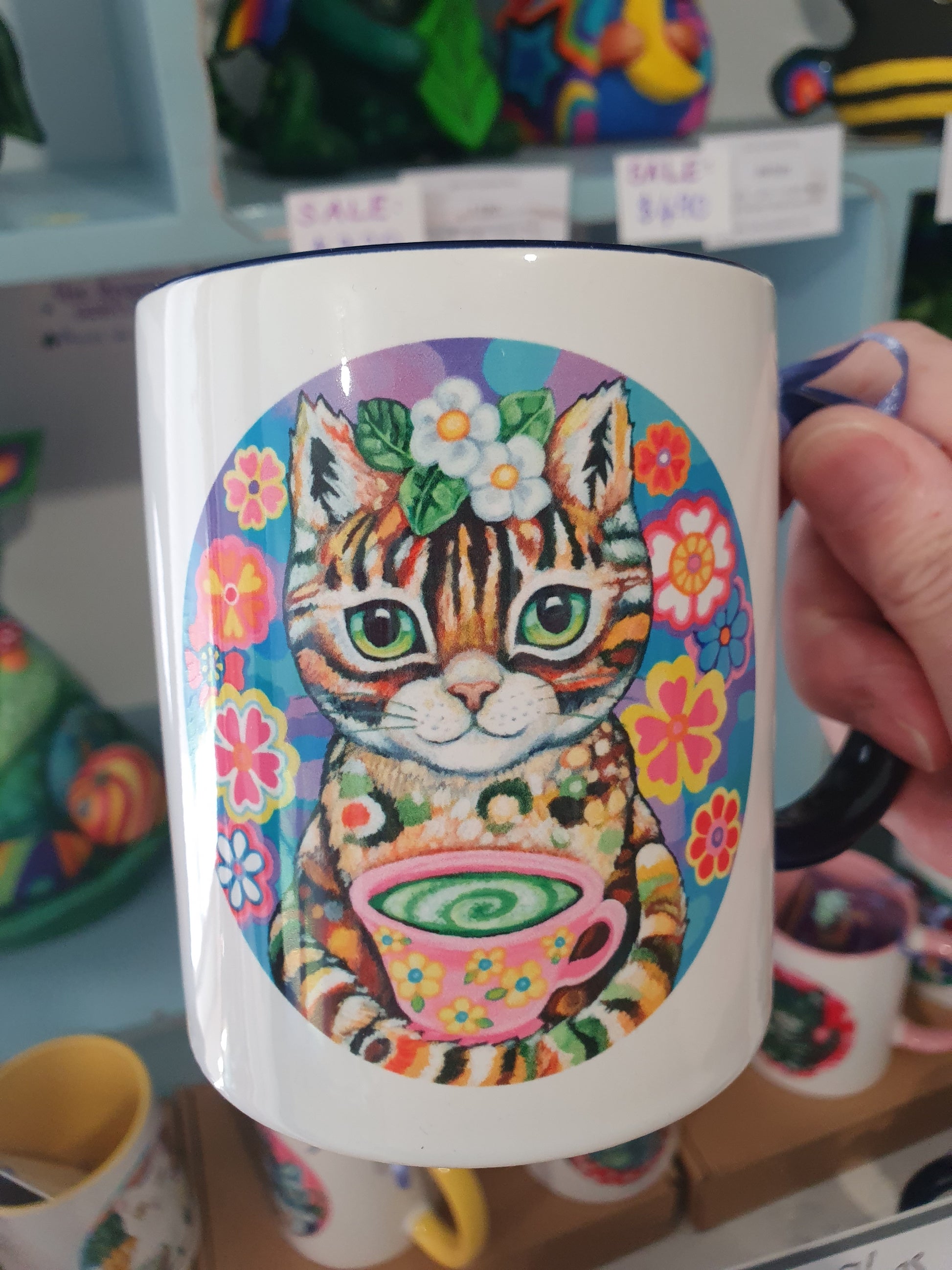 Each mug comes fully coloured on the inside of the mug with coloured handle. Mug size: H 9.6cm x W 8.2cm x D 8.9cm. Image size: (approx) H 7.9cm x W 19.3cm