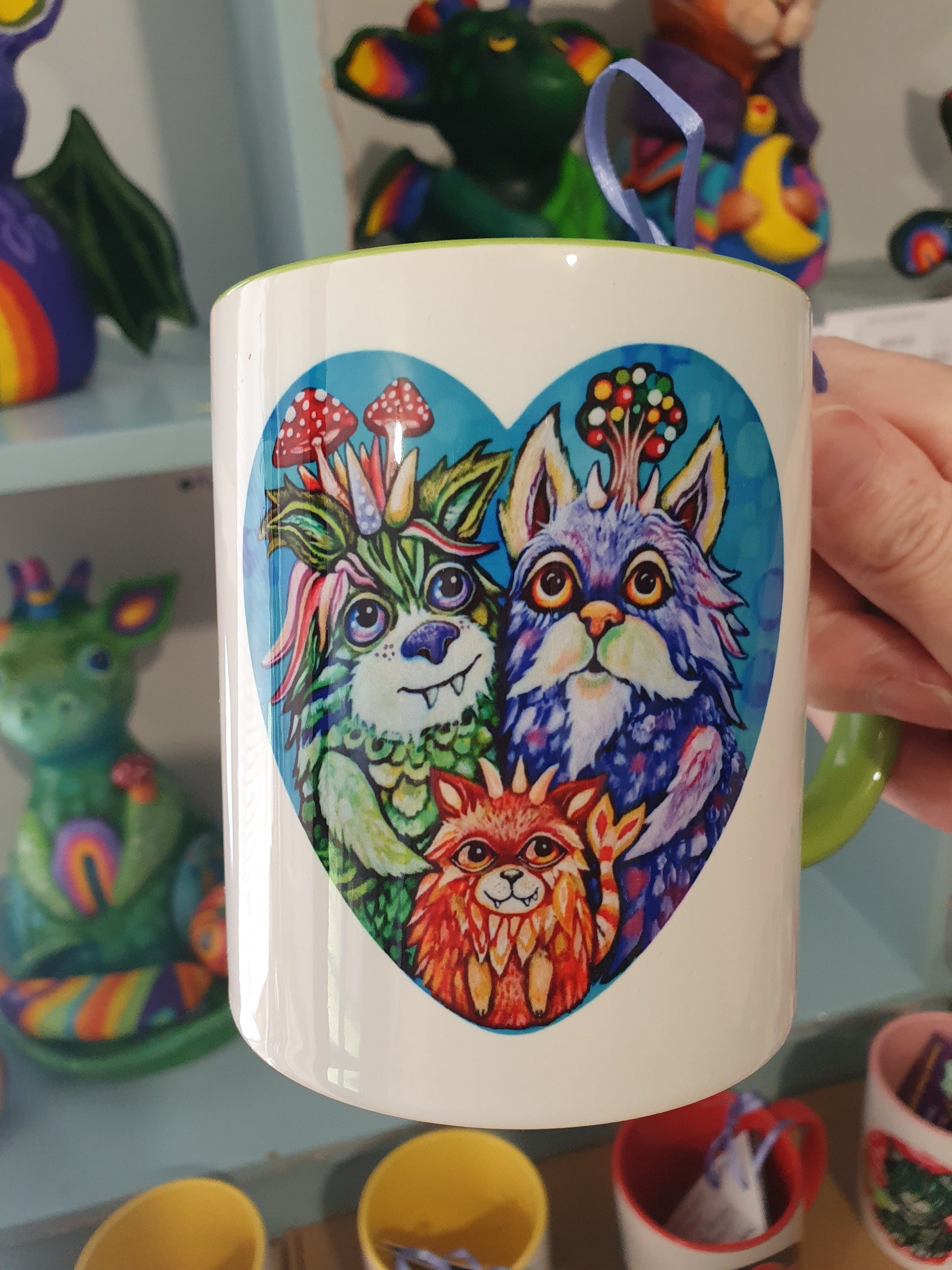Each mug comes fully coloured on the inside of the mug with coloured handle. Mug size: H 9.6cm x W 8.2cm x D 8.9cm. Image size: (approx) H 7.9cm x W 19.3cm