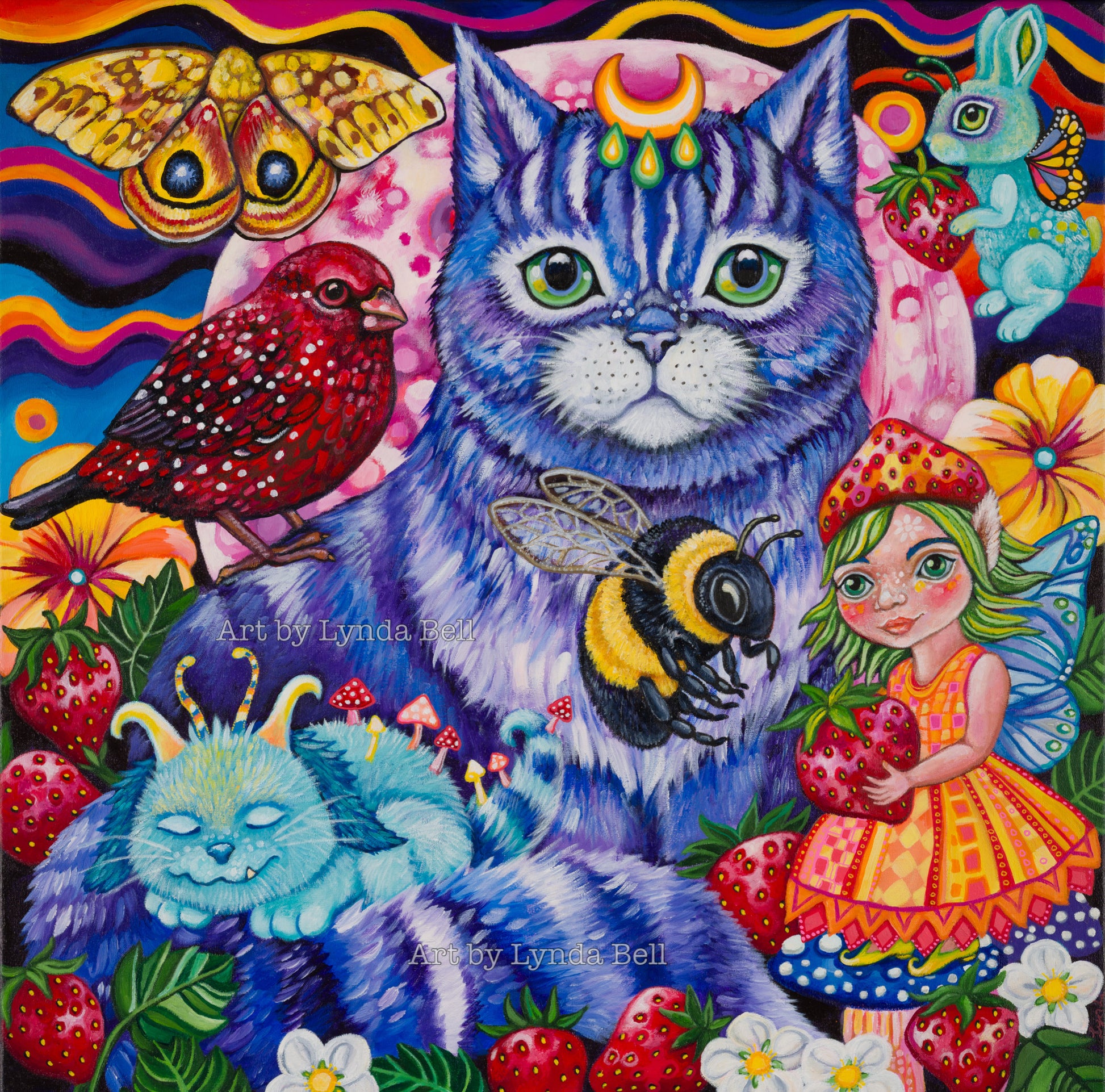 The purple cat goddess is whispering messages of joyful blessings as the creatures of the moonlit night gather close. Take these blessings and fly into the life of your dreams.