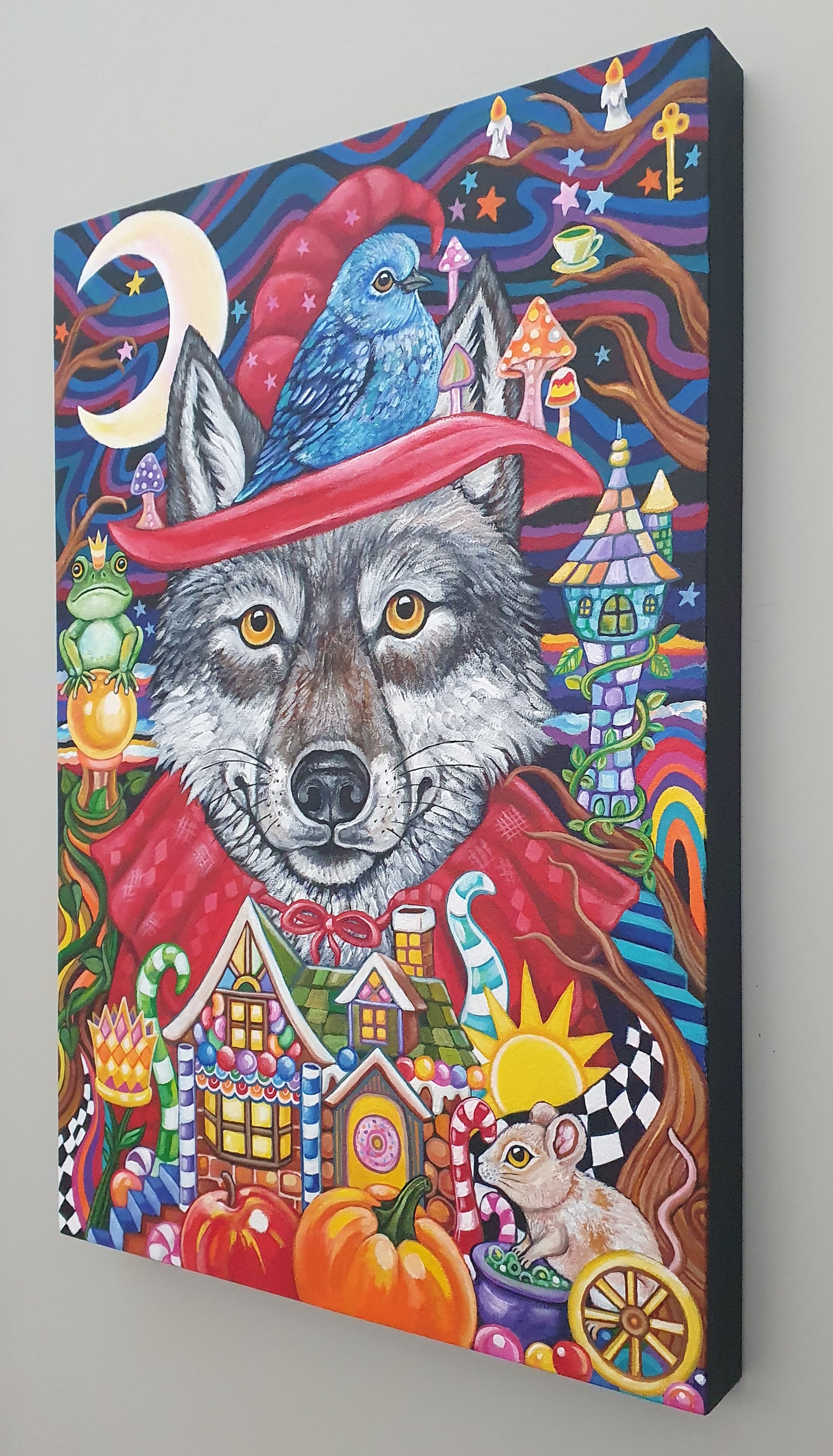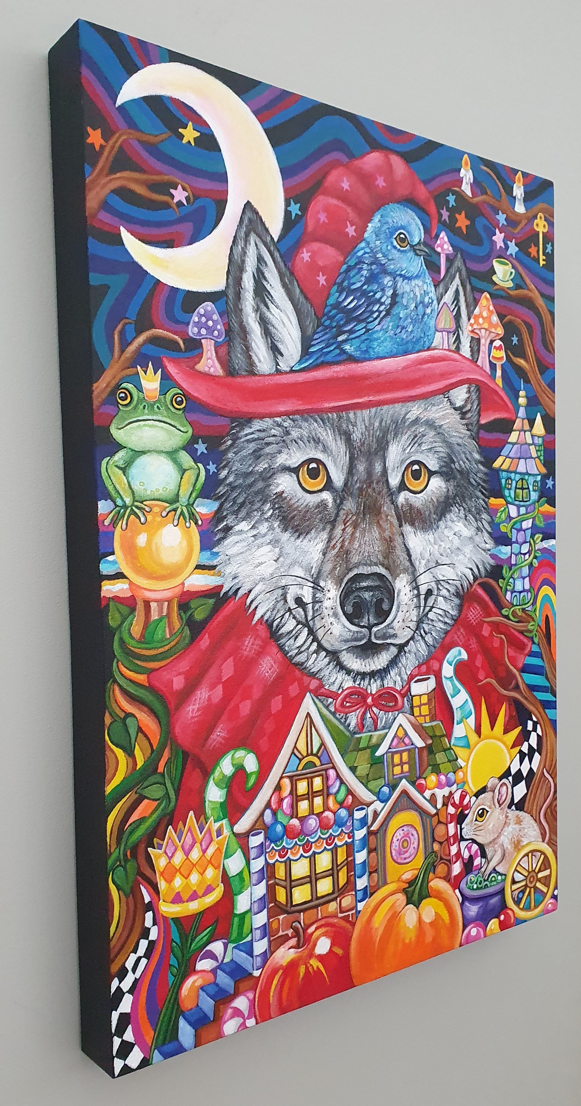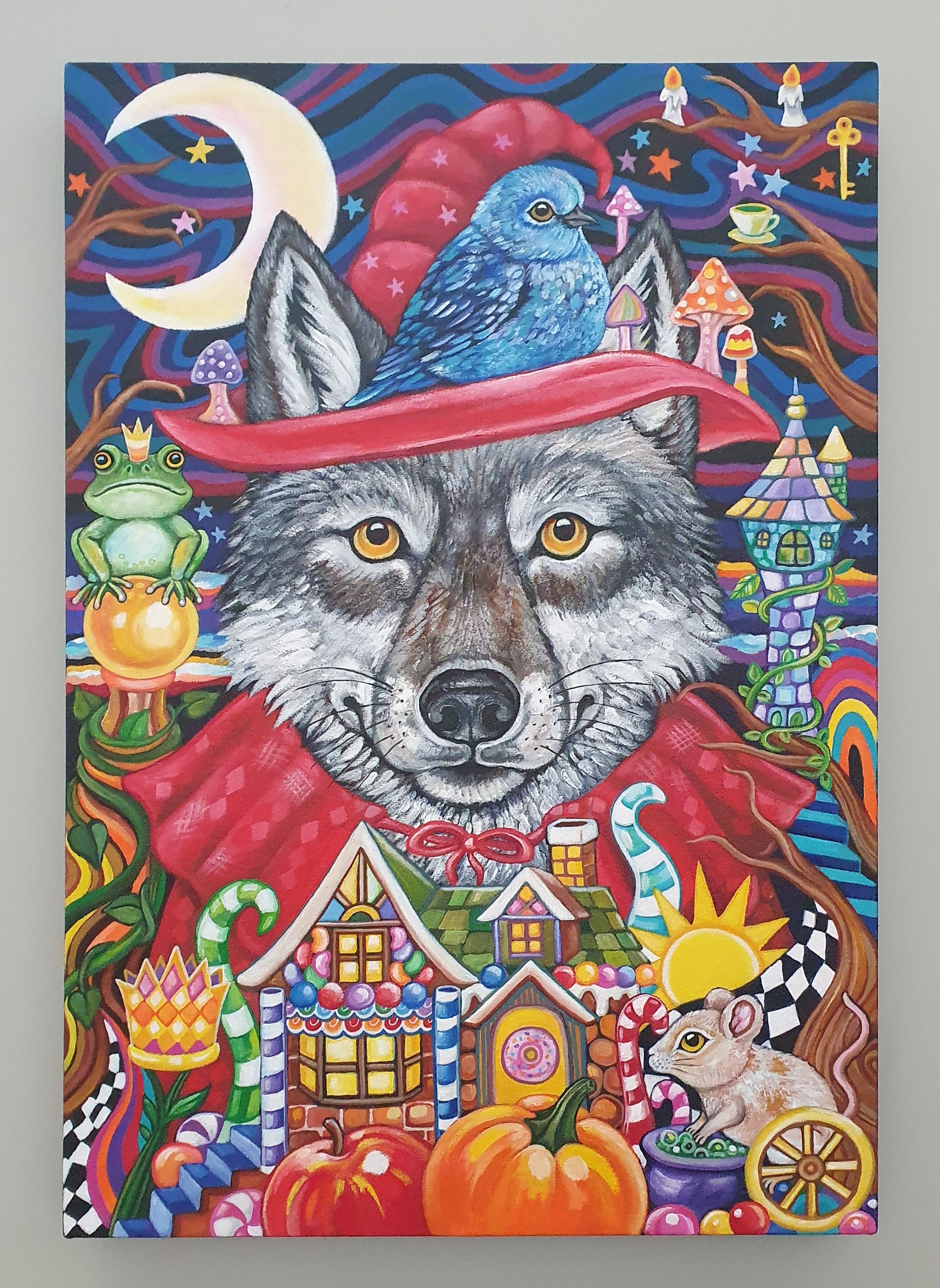 This painting incapsulates symbolism from several well-known tales from the books of Grimm. With the so-called villain figure in the forefront of the painting (the wolf -witch), it gently invites you to explore what response these archetypes conjure for you. The friendly wolf face beckons you to think of these stories in ways you may not have thought of them before.